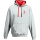 Double fabric hood with contrast inner and contrast cords. Kangaroo pouch pocket.